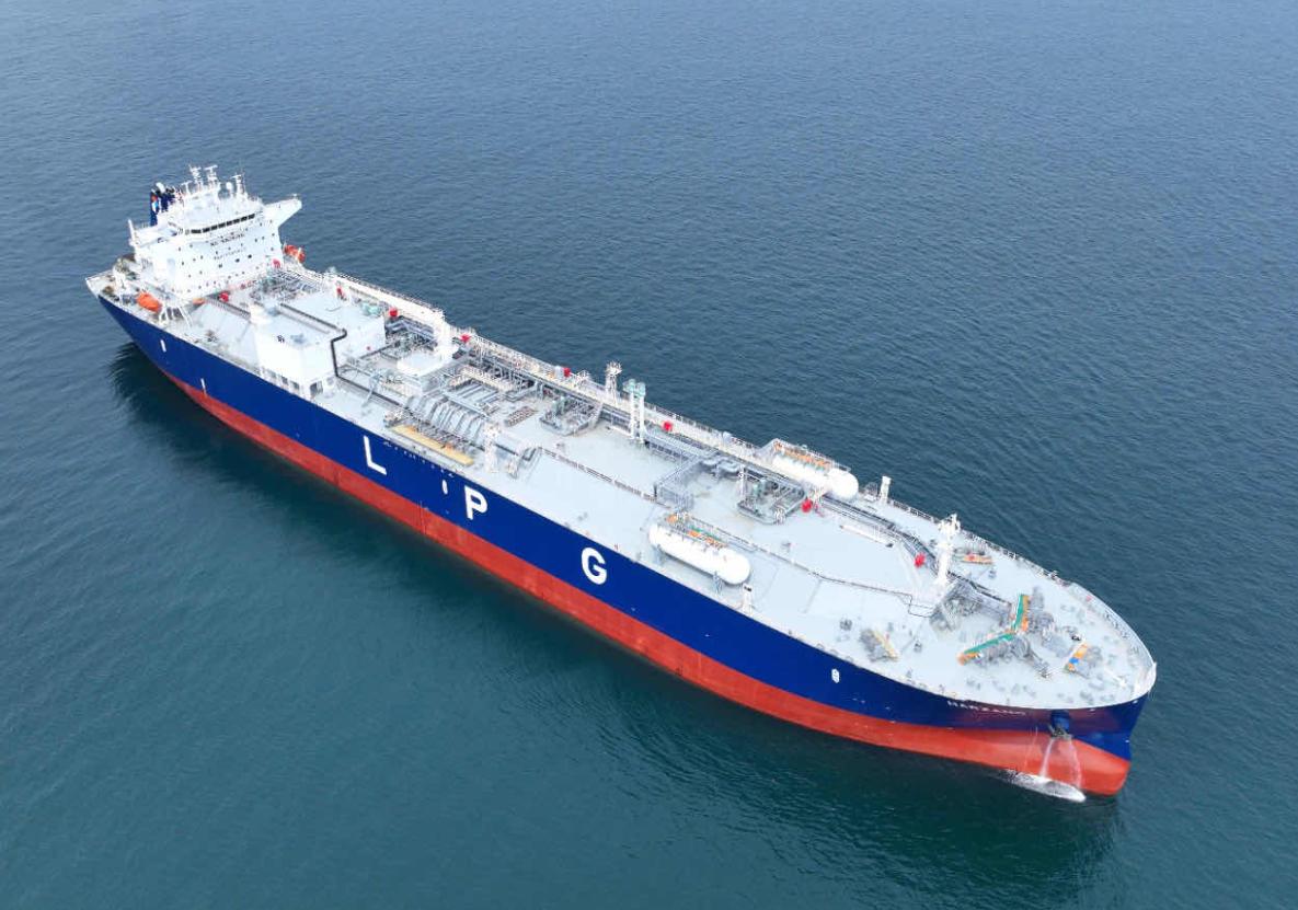 93000立方米VLGC是该公司自主研发设计的第四代VLGC精品船型(Panda93P),是目前世界上最大的VLGC船型,在船舶性能方面均具有较强的竞争优势。该型船总长230米,型宽36.6米,服务航速16.5节,采用第四代专利线型(VS-BowMK-IV),在满载、压载和不同比重的液货装载工况下都能有出色、均衡的性能表现。首次应用自主研发创新设计的舵球节能装置技术,使得船舶的快速性领先国际先进水平,也首次实现了低温钢的全国产化,大幅压缩采购周期。中国船舶集团江南造船93000立方米双燃料超大型液化气船总建造师魏小永告诉记者,为了解决设计舱压低、LPG易蒸发、多舱惰化、驱气、冷罐、加注舱压控制等困难,江南研究院液货技术团队提前半年开始策划,先后提出5种方案,通过专用软件综合模拟LPG的加注量、加注时间及现场施工的便利性,多次讨论修改、细化流程,才确定了“槽罐车对船”的加注方案。
