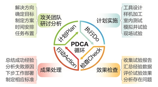 面对地面除锈难以高效彻底除锈,赵增权以萃智(TRIZ)创新理论指导攻关,锁定“井内的问题必须在井内解决”的方向,带领工作室在PDCA循环法基础上制定了“征集问题、评定难题”等七步法,聚力攻关。