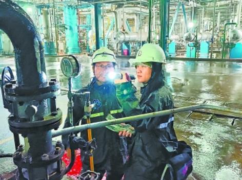7月17日,茂名石化炼油分部员工在雨中巡检。