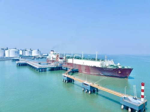 今年以来,天然气分公司全力推进天然气产供储销体系建设,优化国产资源和进口资源结构,高效推进青岛LNG接收站三期、天津LNG接收站二期等重点工程建设,上半年天然气经营总量超200亿立方米,完成全年销售计划的61%。图为7月21日,“阿尔卡缇亚”号LNG运输船在天津LNG接收站2号泊位进行接卸作业。王军 摄 王卓然 文