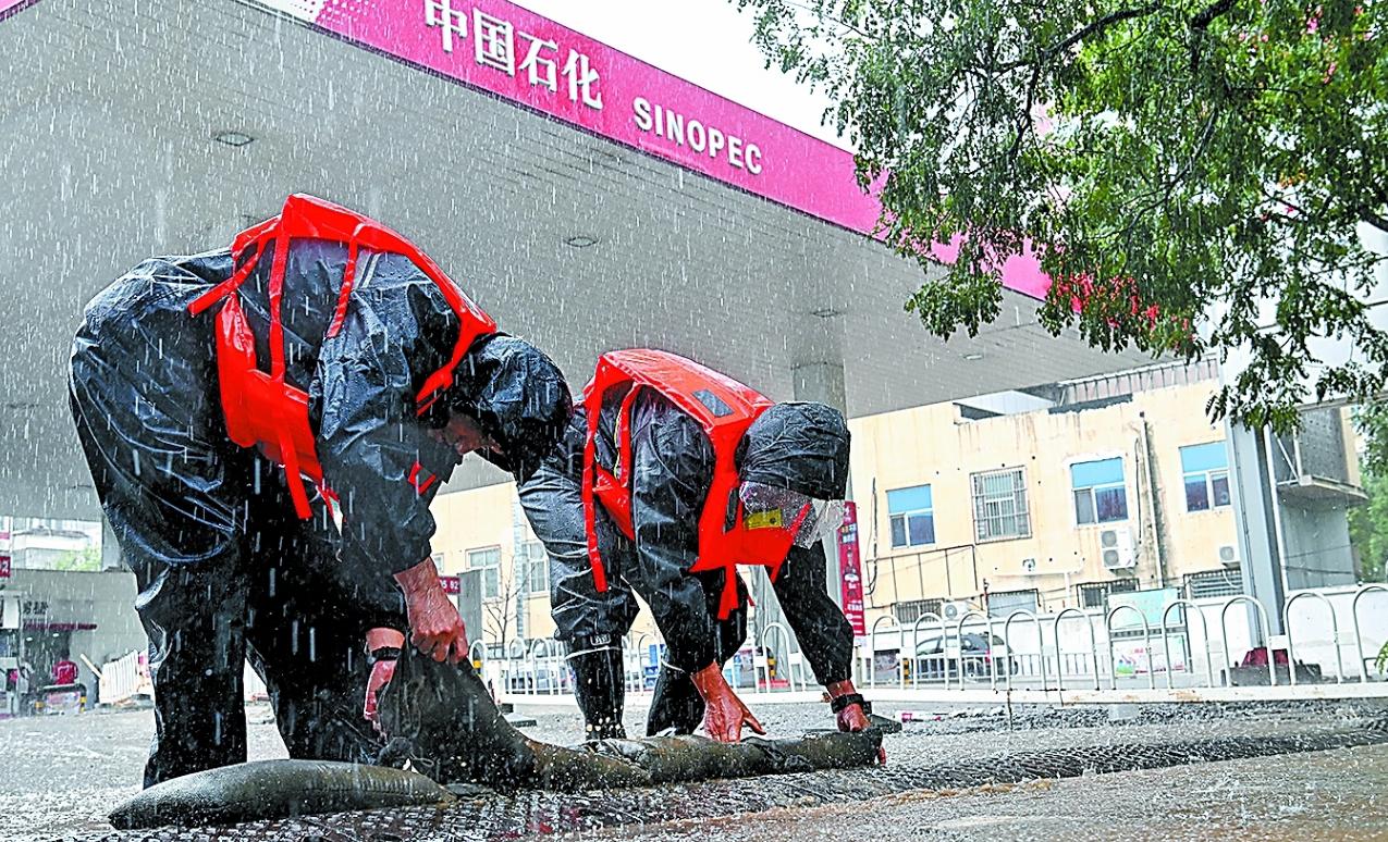 图为8月1日北京石油京西分公司门头沟滨河路加能站员工在雨中摆放挡水沙袋。
