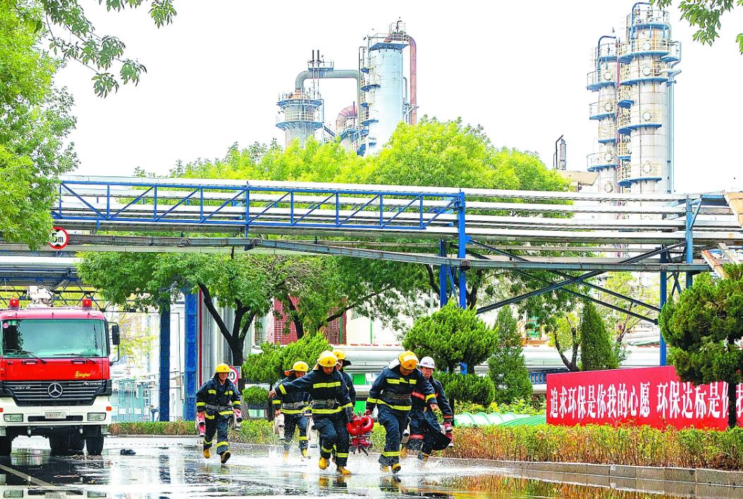 图为7月31日天津石化消防队前往炼油部现场进行排水。