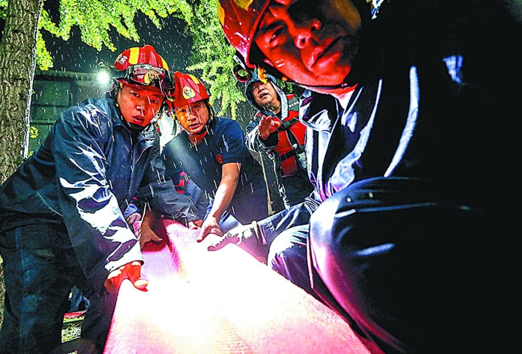 图为7月31日燕山石化救援队在办公区连夜进行紧急排水。