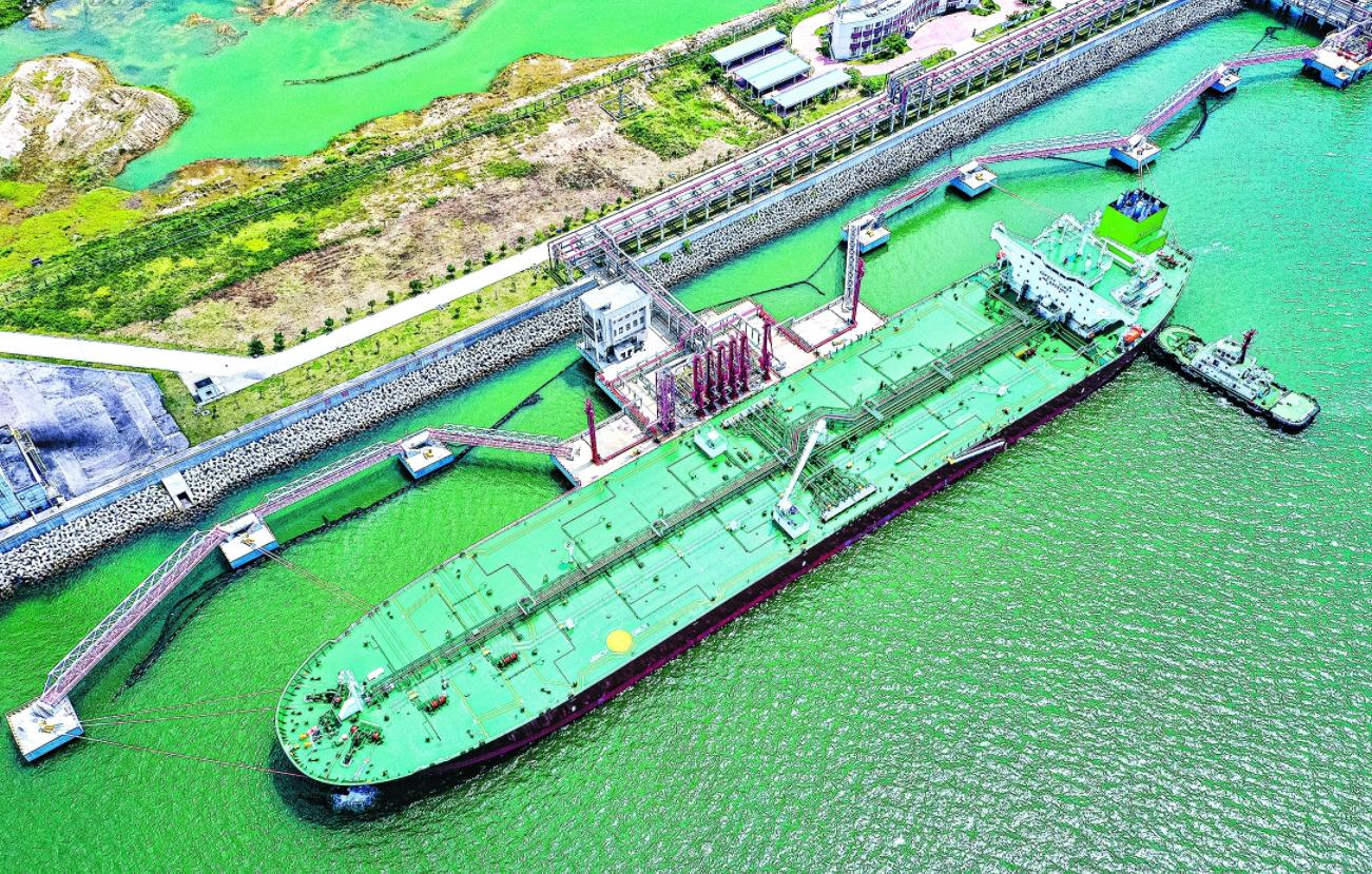 日前,在中科炼化与联合石化密切配合下,装载中科炼化9万吨航煤的油轮从码头驶离,前往欧洲,创系统内单批航煤出口量新高。图为油轮在码头装载航煤。刘理铭摄苏江燕李思漫文
