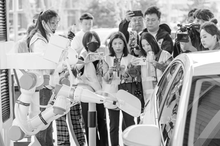 图为蒲新路加油站智能加油机器人为进站车辆加油。