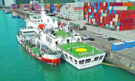 日前,燃料油广东公司作为首航用油独家供应商,历经8小时连续作业,成功为3000吨级海洋维权执法船“中国渔政44002”供应188吨柴油。该船是深圳落实“挺进深蓝”发展战略的重要基础设施,也是我国公务船领域首次申请“智能船舶”符号的船舶。图为供油现场。