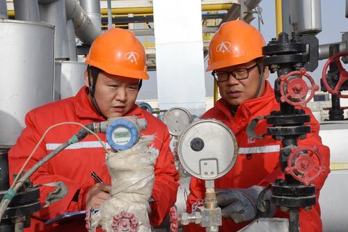 为确保冬季天然气平稳供应,西北油田采油一厂强化天然气生产管理,优化工作制度和间开轮次,加大冬季设备隐患排查力度。截至目前,生产天然气4.8亿立方米。图为11月14日员工在九区净化处理站装置区巡检。孔守曾摄