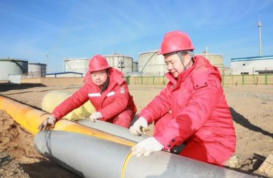 冬季以来,西北油田采油二厂全面检查冬防保温工作,排查油气生产集输设备隐患,组织人员给设备“穿衣戴帽”,实现对裸露管线、管线保温层、保温管外壳全覆盖,确保安全生产。图为油气处理部员工为裸露管线安装保温层。