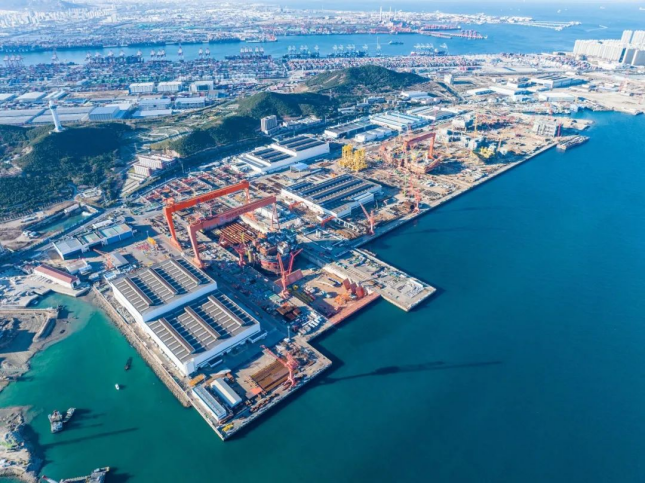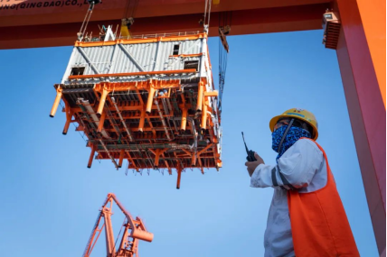 ▲正在青岛海洋工程高新装备制造基地建造的亚洲首艘圆筒型“海上油气加工厂”。侯宪鹏/摄