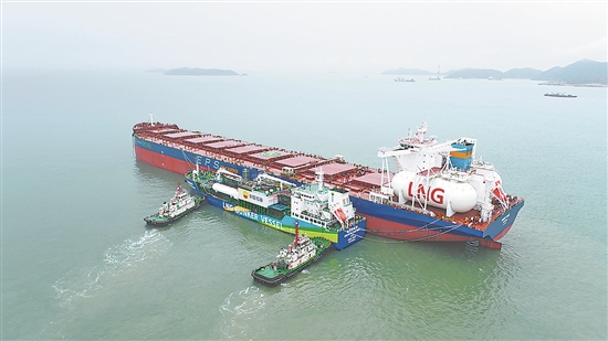 我国首单港口外锚地“船对船”LNG试点加注作业。周子豪 摄