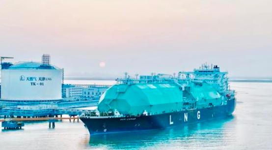 2023年,天然气分公司天津LNG接收站二期项目9座LNG储罐和2个LNG接卸泊位全部建成,总储气能力10.8亿立方米,居国内已投产LNG接收站首位。图为天津LNG接收站2023年接收的最后一艘LNG运输船“斯里卡马尔”号。