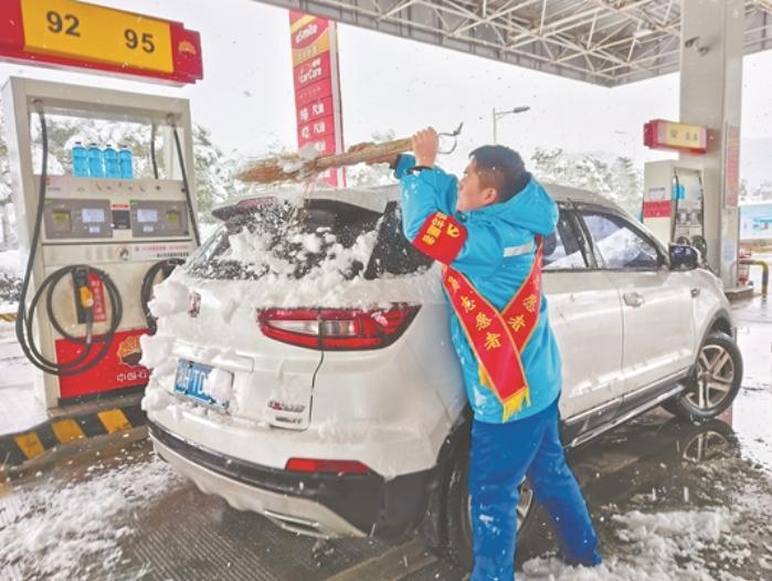 为保障旅客出行,湖南销售通过优化排班、机关帮扶等方式,保障现场服务质量。各分公司组织机关员工、党员、青年突击队,与加油站员工一起,及时清理库站进出口车道积雪,在营业厅、卫生间出入口等处铺设防滑垫等,防止滑跌,保障安全。各加油站因地制宜,免费为客户提供热水、姜茶等,在便利店内设立环卫工人及市政除雪工作人员休息专区,为加油客户清除车上积雪,用热情的服务助力人们温暖出行。