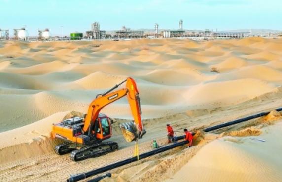 今年以来,西北油田加快自顺北油田天然气处理厂至4号条带注气主干管线建设,利用处理合格的天然气为主力开发区块注气补能,从而减缓自然递减、保持稳产增产。该管线直径323毫米,总长53公里,目前多区段同步实施焊接和铺设工作,预计于3月中旬完成全线建设。图为1月15日施工人员进行管线铺设作业。