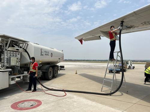 今年以来,山西运城石油紧盯航煤市场需求,不断加快航煤出库速度,截至5月16日,航煤发货量超2.2万吨。图为航油部员工为盐湖国际机场的飞机加油。崔晓雪摄