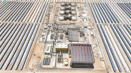 其中,CPECC第一建设公司承建的PT3动力岛油盐区安装工程是200兆瓦槽式光热发电机组的核心装置,于2022年7月15日正式签约,今年4月15日投入商业化运行。该工程包含传输和储热两部分,可在白天通过镜场聚焦太阳光照辐射,以导热油为介质,实现能量的吸收与传递;夜间通过低温导热油与熔盐进行热能交换,为发电机组提供持续的能量供应。
