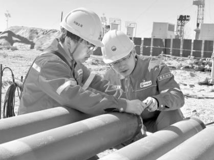 员工检查注采管道坡口加工情况。