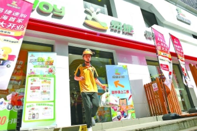 外卖骑手在上海石油“易捷速购”店为客户取货。