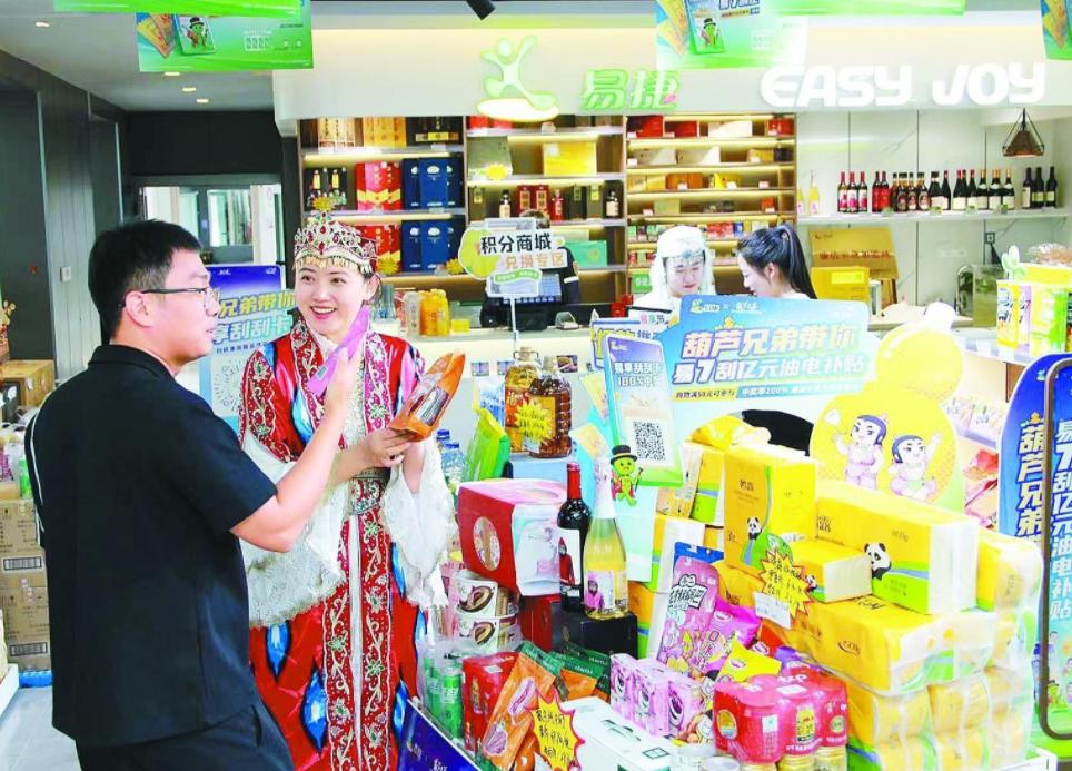 为保证节日期间客户顺利出行,新疆石油两级机关党员干部重点围绕高峰期的效率提升进行到站帮扶,协助站点引导车辆、推荐易捷商品、维护现场秩序等。图为10月5日伊犁石油党员到站帮扶,向客户推介新疆特色商品。