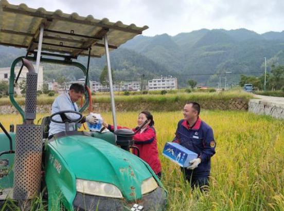 图2:10月9日,浙江温州石油组织志愿者到泰顺县下洪社区水稻基地,为农户送水,帮助农户收割稻谷3000公斤。陈小华 摄