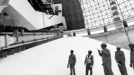 中原油田普光气田1号料仓的储存能力5.7万吨,是国内最大的硫黄料仓,目前该料仓堆取料机经过检修后,顺利投入运行,堆、取料能力均为1000吨/小时,助力硫黄高效装车出厂。图为11月14日员工查看堆取料机运行情况。