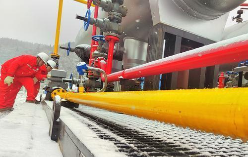 12月7日,华东油气分公司重庆武隆工区突降大雪,南川常压页岩气田对工区内天然气处理装置和辅助设备开展全面排查,对管线设备的保温、伴热进行维护保养。供暖季以来,该气田累计供气超2亿立方米。图为员工在评地2HF井巡检。
