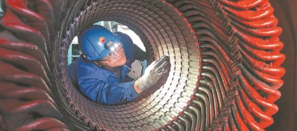 图为水电厂电气专业技术人员对锅炉给水泵电机进行细致检修。