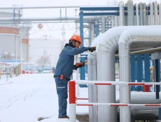 近日,新疆地区迎来降雪,塔河炼化组织开展积雪清理行动,对储罐、机泵仪表设施情况逐一检查,对管线伴热进行测温,对伴热阀门进行调整,全力保障冬季安全生产。图为班组人员对管线进行测温检查。