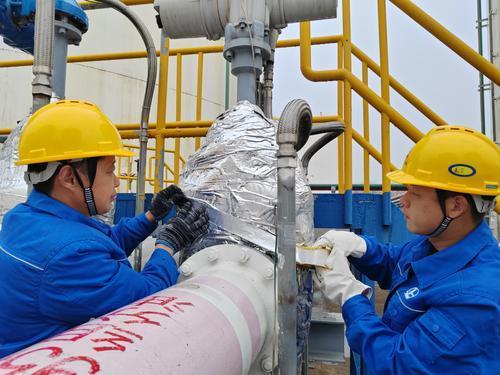 入冬以来,安徽淮南石油进一步加强库站设备安全管理,扎实做好防冻、防滑、防火、防中毒的冬季“四防”工作,落实隐患排查治理责任,对仪表、阀门、管道等设备设施进行全覆盖防冻保温检查,确保冬季生产安全平稳。图为淮南油库员工对设备进行保温防冻处理。葛如俊 摄