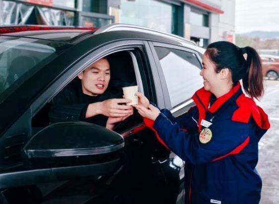 连日来,贵州地区气温持续下降,贵阳石油开展送温暖活动,为排队等候的顾客、前来歇脚的户外工作者提供热水、姜汤等。图为2月18日贵阳石油吊堡加能站员工为客户服务。