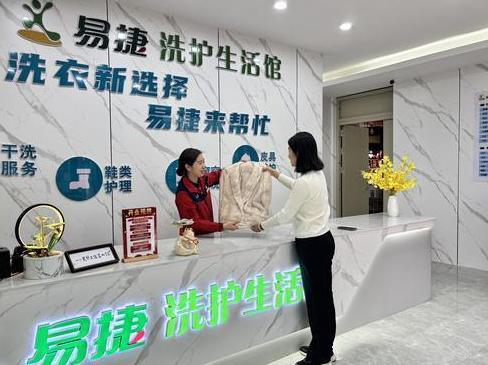 近日,江西抚州石油首座易捷洗护生活馆在临川第一加能站投运,设置高端洗护、家纺洗护、鞋靴洗护、干洗服务四大服务模块,配备专业洗护设备与技术团队,提供衣物鞋包精洗、床品深层护理等全场景服务,一站式解决全家洗护需求。图为员工为客户提供洗衣服务。