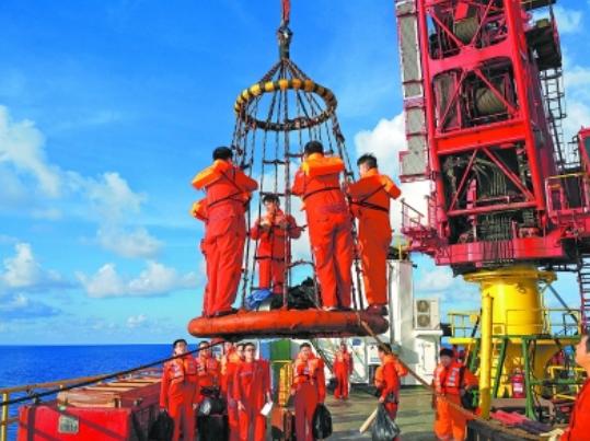 6月11日,上海海洋油气分公司在南海工区作业的勘探三号平台通过吊笼将人员撤离至保障船。