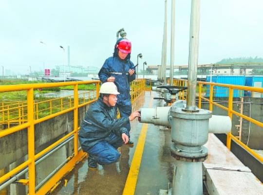 6月12日,中科炼化公用工程部员工检查雨水闸板阀开度,确保雨水回用率。