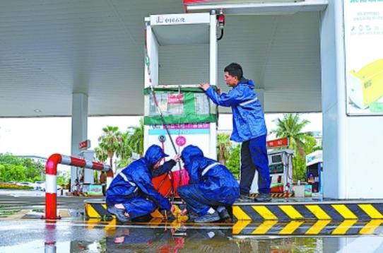 6月12日,海南儋州石油中兴加能站员工为加油机盖上雨罩,保障设备安全。
