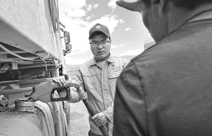 珠峰北加油站经理拉琼次仁为工程车辆加油。
