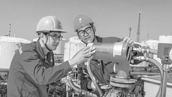 6月29日下午,抚顺石化储运部演武油库作业区热浪灼人。在114号储罐罐顶,抚顺石化工建公司储运运维联合车间党员、施工员林鹏(右)与技术骨干张伟,正全神贯注地检查伺服液位计。
