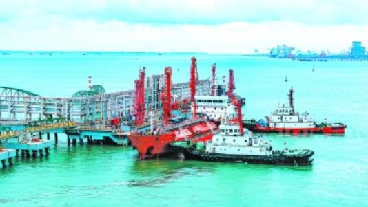 7月2日,中科炼化新增液化烃码头完成首次卸船作业——1317吨丙烷通过管线完成卸货,标志着该公司液化烃码头二期项目投入运营。液化烃码头二期项目新建5万吨级液化烃泊位、2台低温丙烷罐、12台球罐及配套储运设施,设计年通过能力达252万吨,可满足丙烷、丁烷等液化烃产品接卸需求,有效提升华南地区液化烃接卸储运能力,为企业生产提供更加安全高效的原料保障。图为液化烃码头现场。