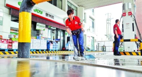 7月10日,北京市气象台发布暴雨蓝色预警,北京石油、燕山石化等企业第一时间行动,迅速启动防汛应急预案,全面部署各项安全环保工作,加强重点设备巡检,为首都能源供应提供坚实保障。图为7月10日北京石油凯旋加能站员工清理站内积水。
