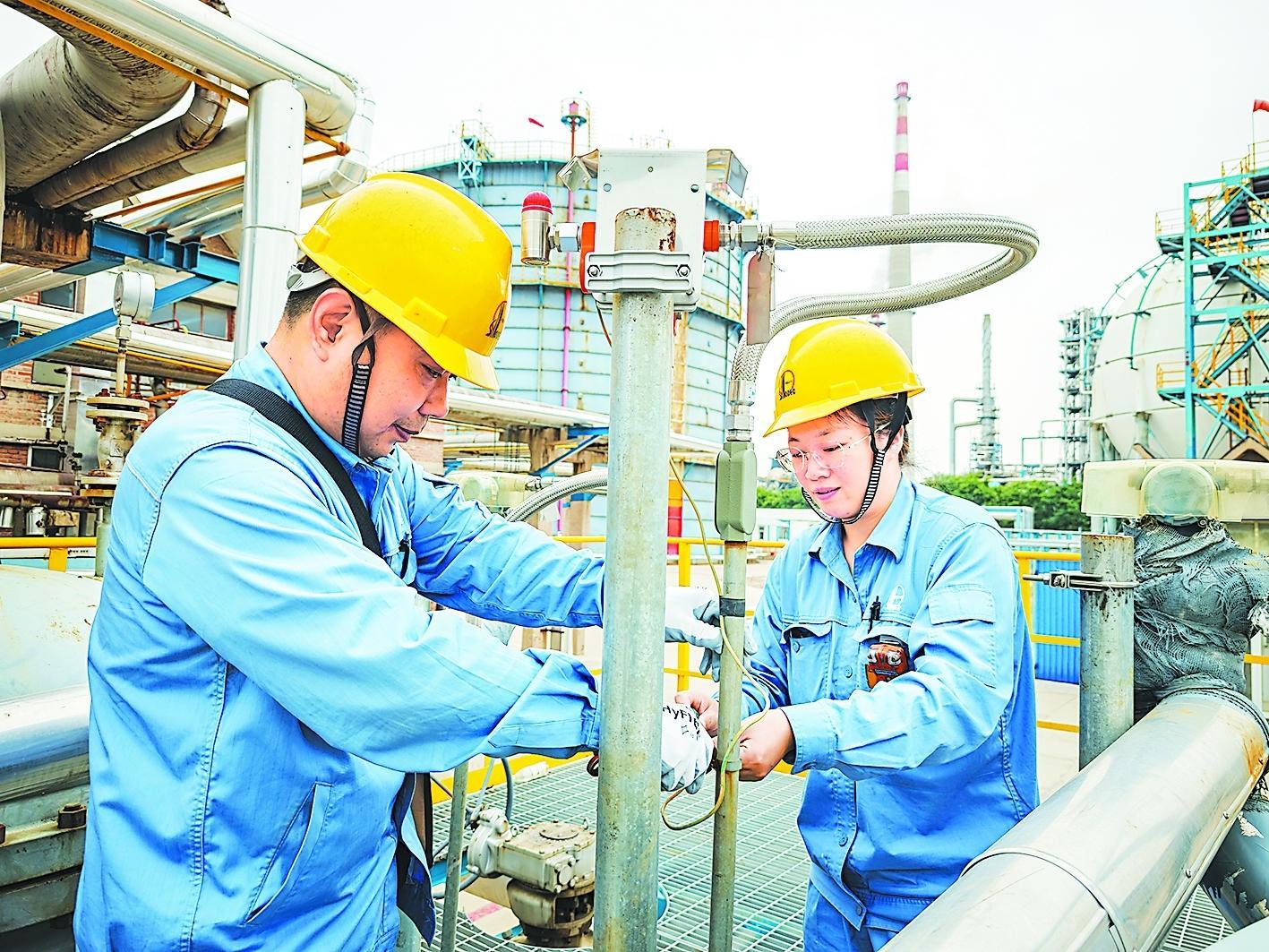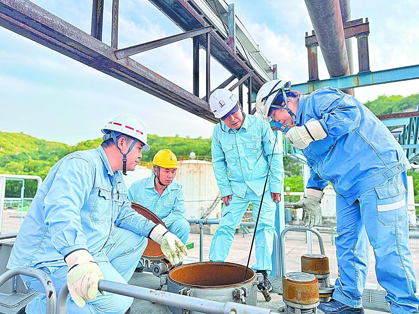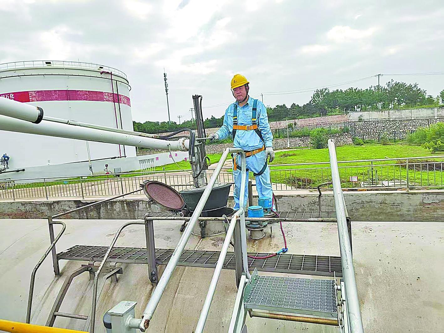 沧州炼化储运部员工在成品油罐区调和汽油。