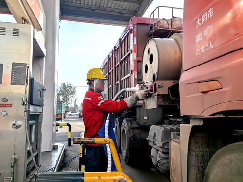今年以来,山西石油聚焦天然气业务增量创效,通过优化网络布局、强化资源统筹,抢抓市场机遇,开拓销售渠道。上半年,天然气销量同比增长154%。图为朔州石油小峪加能站员工为货车加气。边伟涛 摄 秦晓耕 文??????
