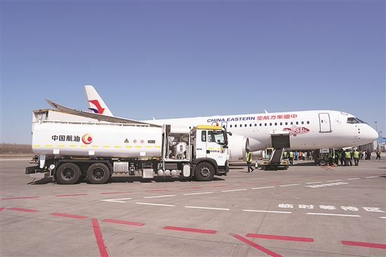东北销售与中航油公司联动,在沈阳桃仙机场为国产C919飞机加油。王冬雪 摄