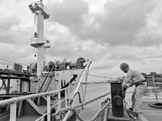▲7月30日,为应对台风影响,南化公司加大对码头设施、靠泊船只的巡查力度,仔细检查缆绳系泊情况,确保船只稳固。对露天设备和物资进行二次加固,防止被大风刮落造成安全隐患与财产损失。图为员工检查缆绳系泊情况。