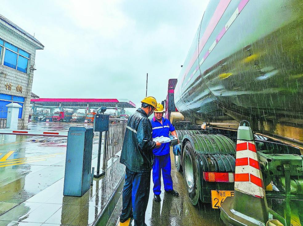 8月15日,广西石油钦州油气库员工雨中做好油罐车入库提油安全检查。