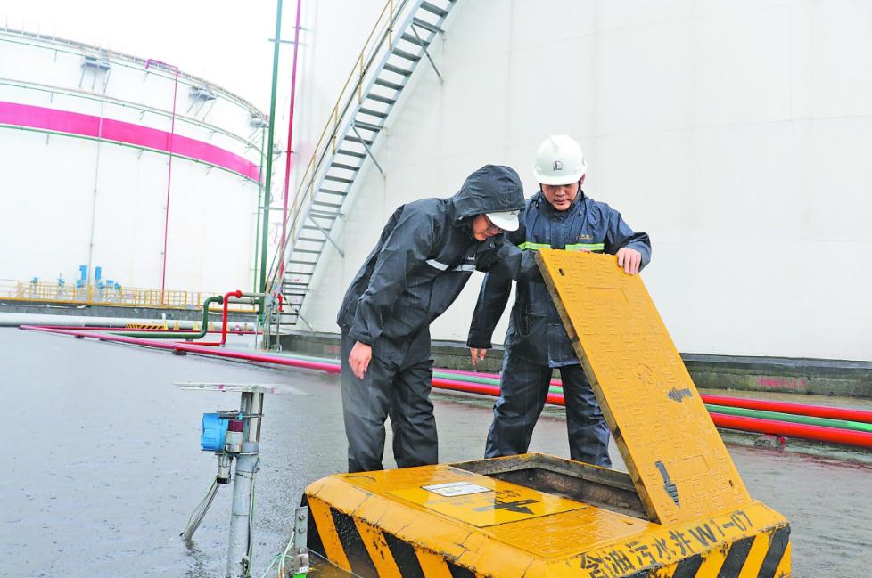 8月14日,销售华南湛江区域中心巡检人员细致检查库区雨污分流系统运行状况。