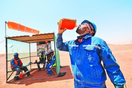 百米内就会有一个“清凉补给站”:遮阳棚下摆满冰水、电解质饮料、龙虎丹,2200多个水壶每天清晨装满凉白开,180把遮阳伞在作业点撑起移动阴凉。“Sinopec is good。”印度籍力工沙米尔举着灌满凉水的水壶说道。