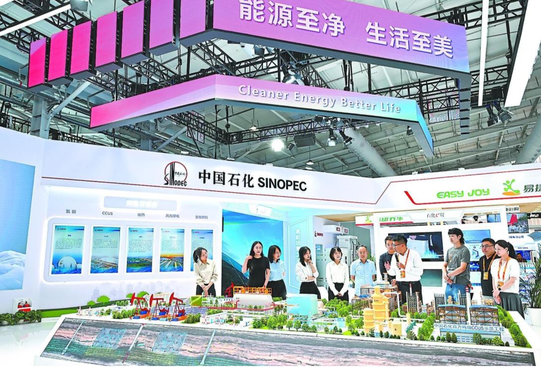另一处的电子屏系统展示氢能、CCUS、地热、风光绿电及生物燃料等洁净能源布局。点碳成金,变废为宝。中国石化高质量建成投运我国首个百万吨级CCUS示范工程,2025年7月由中国石化牵头组建的国际CCUS技术创新合作组织成立,推动CCUS技术迭代创新应用。在展区现场,齐鲁石化—胜利油田百万吨级CCUS示范工程模型生动呈现减碳增油创新实践。“该项目年均增油20万吨,年可减排二氧化碳100万吨,相当于植树近900万棵。”讲解员宋宝林介绍道。