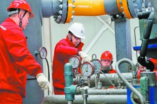 天然气分公司西北销售中心是中国石化统筹推进国内上游天然气销售体制改革,并结合天然气分公司业务特点成立的首批区域天然气销售中心之一,管理运营404公里长输管道及10座站库,负责区域内天然气统购统销、终端开发及管道建设,累计经营管道天然气97.7亿立方米、LNG43万吨、LNG直供站点52座。图为员工在检查压缩机运行状况。