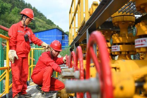 今年以来,西南油气分公司采气四厂依托老井稳产、边远井产销和基础管理提升三大专班协同驱动,细化各项保障措施与关键时间节点,全链条推动老井稳产、新井投产等任务完成。截至目前,今年已累计生产页岩气超10亿立方米。图为员工在丁页12平台巡检。 任远均 摄 王亚娟 王 坤 文