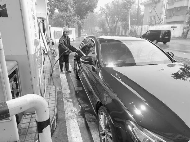员工在雨中为客户加油。