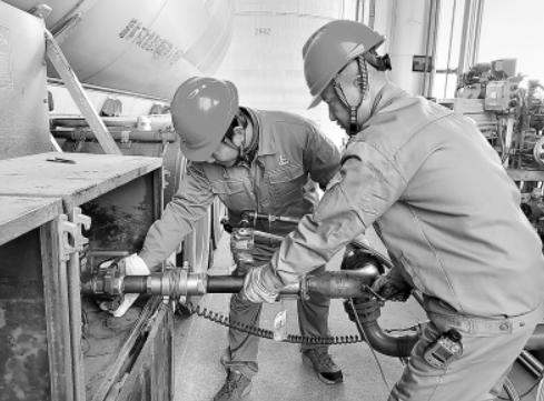 近日,安庆石化按照集团公司有关要求,对装卸设施进行系统性排查,同时,对危化品运输、装卸规章制度、装卸过程管理等进行梳理,确保危化品装卸过程安全受控。图为11月5日员工进行液化气充装前的检查确认。