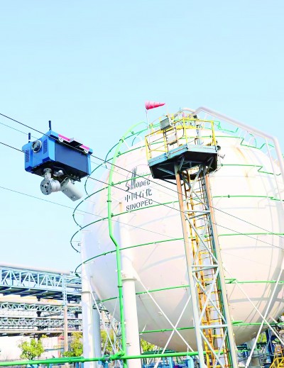 镇海炼化飞索智能机器人掠过球罐区域。